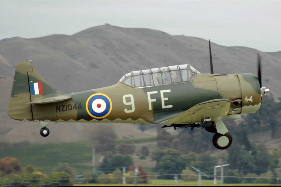 This Harvard is one of 202 ordered by the RNZAF in 1943. Arriving in June that year, the aircraft was flown by No 2 Fighter Operational Training Unit at RNZAF Ohakea during WW2. In April 1945 it suffered minor damage when a gear leg collapsed as the aircraft taxied off a runway (because the undercarriage down lock was not properly in place). With a new aileron and wing tip, NZ1044 was quickly returned to service.