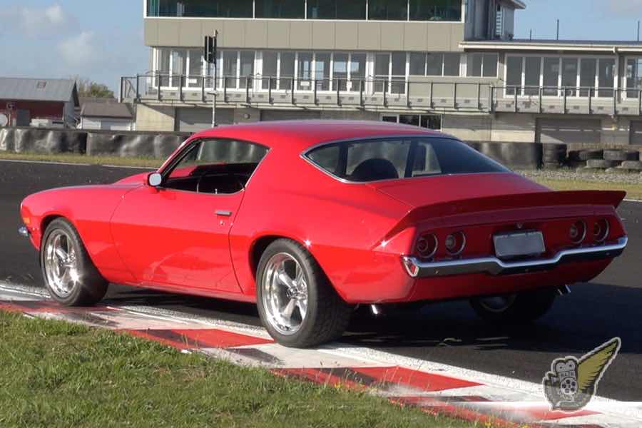 Andrew Vile's stunning Victory Red 1971 Camaro on the track at the Manfeild Motorsport Park in Feilding, New Zealand.