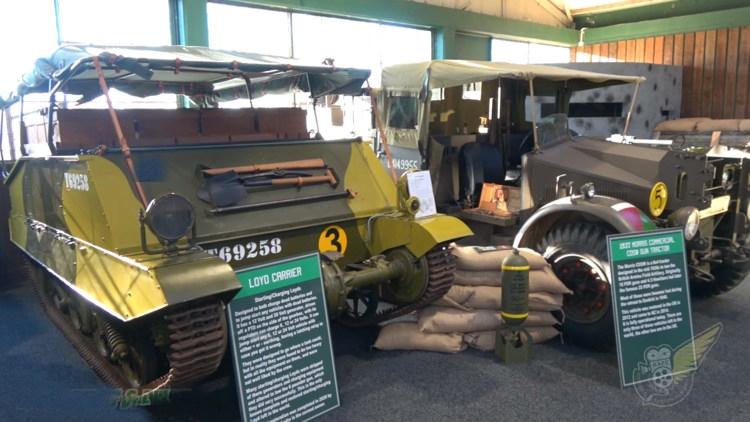 There are a variety of light military vehicles on display, including the Loyd Carrier (seen at left), and the Morris gun-tractor truck (at right), both of which were used during WW2. Photo: © Historical Aviation Film Unit