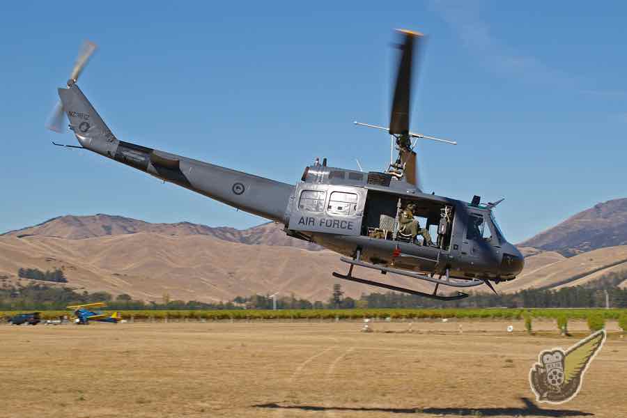 An RNZAF Iroquois helicopter participates in a ground support display during the Royal New Zealand Air Force's 75th Birthday celebration airshow at RNZAF Ohakea in 2012.