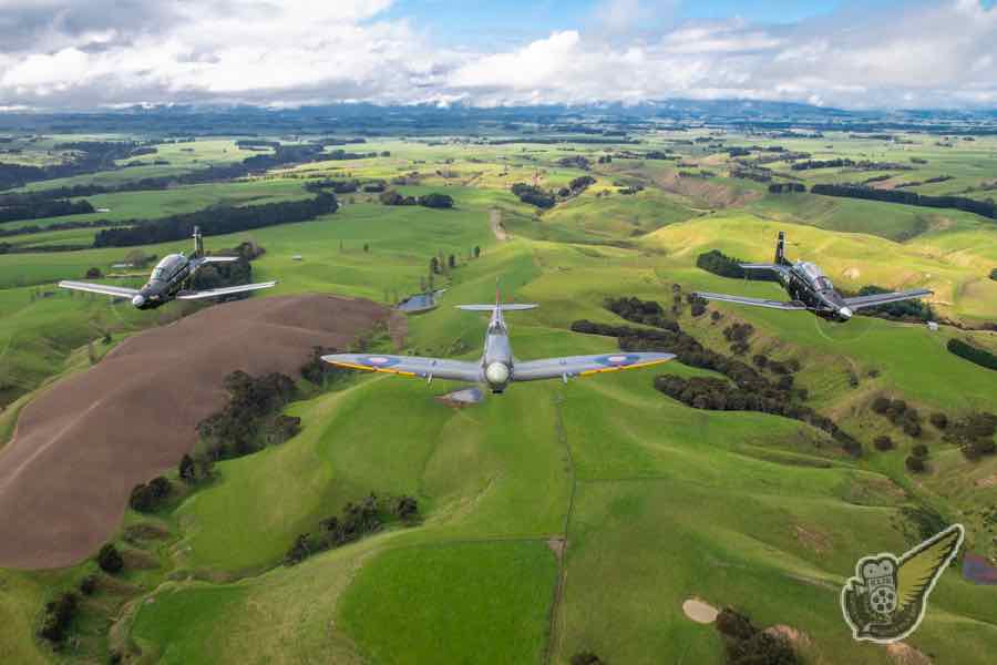 RNZAF Texans and the Spitfire perform a flypast to commemorate ANZAC Day across the Manawatu and Whanganui regions in 2022. Photo © Royal New Zealand Air Force - Supplied
