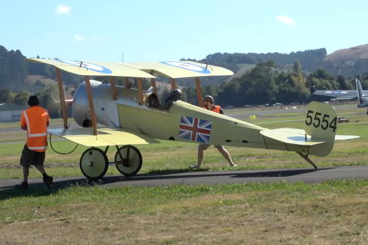 In addition to the World War Two-era and later aircraft that operate under the wings of the NZ Warbirds Association, the organisation has its own collection of six World War One-era aircraft. This replica Bristol Scout is powered by an original rotary engine, and can often be seen mixing it up in a mock dogfight with the Association's (German) Fokker Dr.1 Triplane and Albatros D.Va fighters. Copyright © Historical Aviation Film Unit