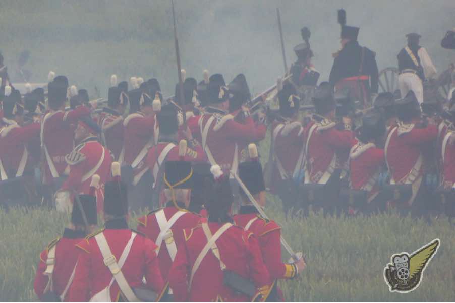 British troops on the battlefield at Waterloo (in 2015). The haze in this photograph is the 'fog of war' that is created by the black powder smoke from all the muskets and cannon firing on the battlefield. Women were not allowed to serve in the British Army during the Napoleonic Wars.