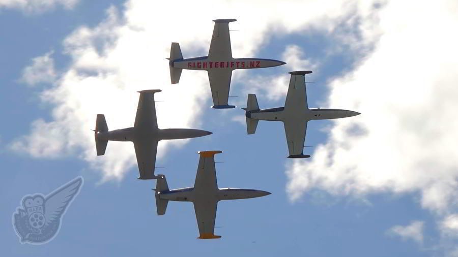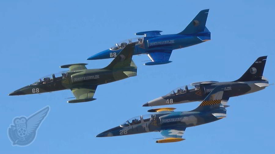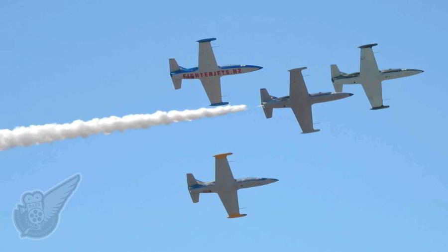 The American Eagles display team, known as the Patriots Jet Team in the USA, used New Zealand based Aero L-39 Albatros jets to show off their high precision jet formation flying. Copyright © Historical Aviation Film Unit