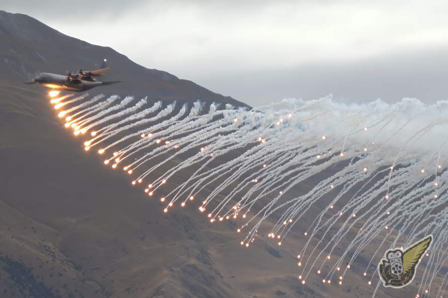 An RNZAF C-130H Hercules drops flares over Lake Wanaka during an evening display on Good Friday. The Air Force's Hercules are soon to be retired, being replaced with new C-130J models. Historical Aviation Film Unit