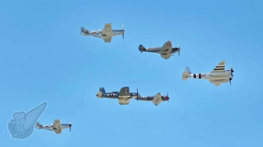 The six World War Two-era fighters during their final 'balbo' (massed formation) flight. Lead by the de Havilland Mosquito the formation then consists of the Yak-3U (LHS rear of Mosquito) and the Spitfire Mk.IXc, followed by the FG-12 Corsair and two P-51D Mustangs. The rumble of five V-12 Merlin engines, along with a couple of Pratt and Whitney radials was simply outstanding. Copyright © Historical Aviation Film Unit