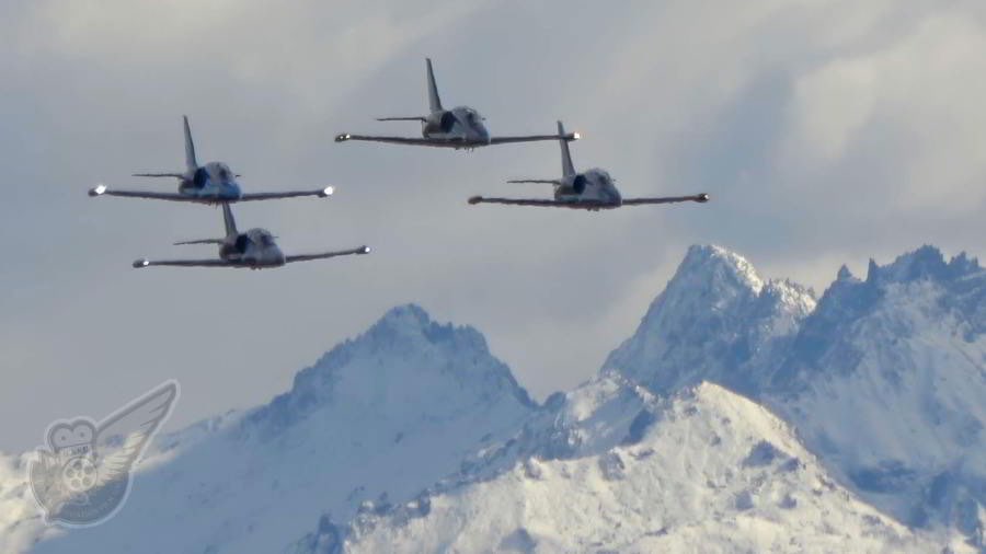 The American Eagles L-39 jet formation team scream in toward the airfield against the magnificent backdrop of the snow-covered Southern Alps. Copyright © Historical Aviation Film Unit