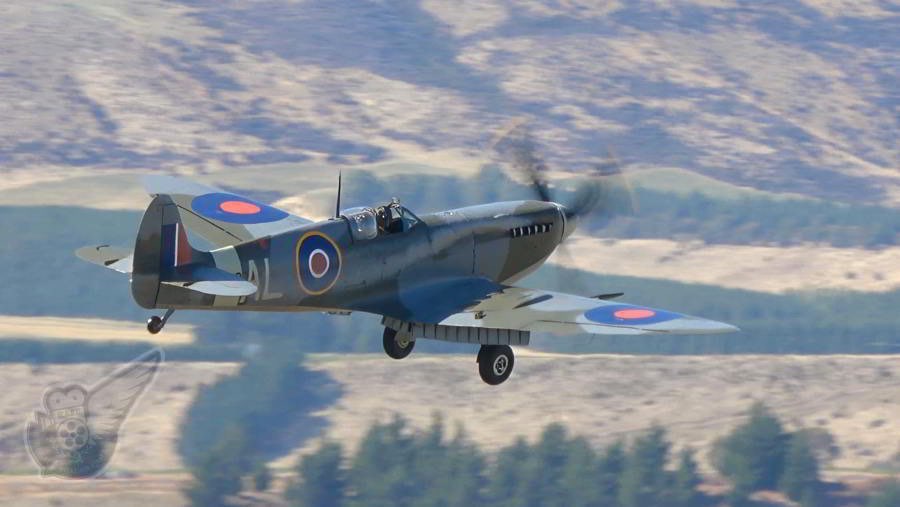 The Biggin Hill Historic Aircraft Centre's Mk.IXc Spitfire, in the colours of New Zealand WW2 Ace Al Deere, is a firm favourite at Wanaka and all the other NZ airshows she has attended over the past 15 years or so. Pilot Stuart Anderson (also leader of the RNZAF 'Black Falcons' display team) sideslips the aircraft onto the grass runway at Wanaka after a display with the BHHAC's P-51 Mustang. Copyright © Historical Aviation Film Unit