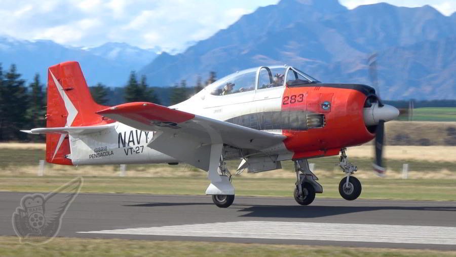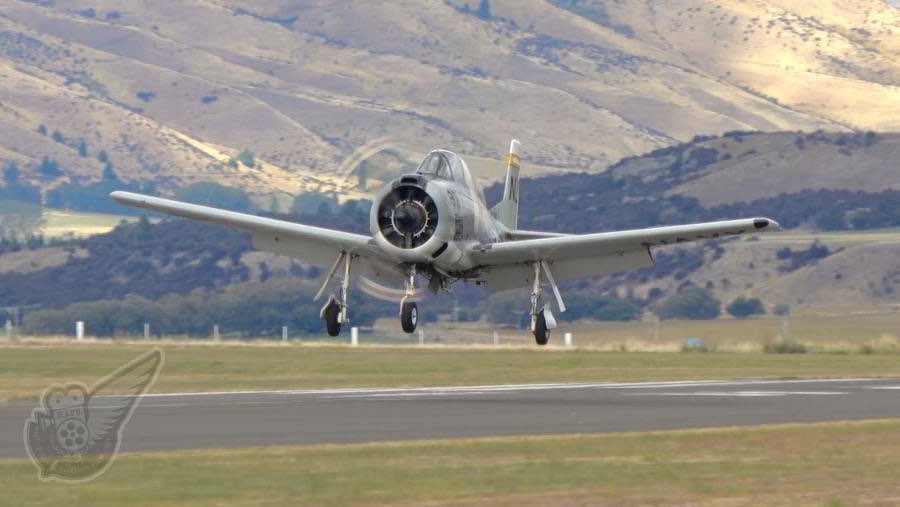 Peter Vause's Trojan T-28B lands at Wanaka after a lengthy ferry flight from its home base in New Plymouth (in the North Island). The second New Plymouth-based Trojan was also due to perform at this year's airshow (making up a three-ship T-28 formation), but unfortunately that aircraft was delayed en route due to maintenance issues. Copyright © Historical Aviation Film Unit