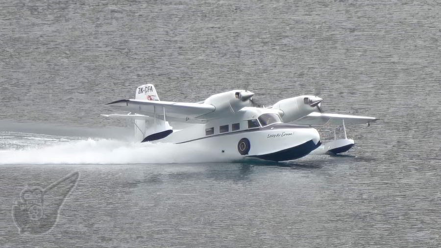 Grumman Super Widgeon ZK-CFA has a long and distinguished service career in New Zealand, flying a number of maritime air routes, with several different small airlines, over several decades. Now based in Northland the aircraft no longer performs water landings at sea, but as shown here will performs such feats on fresh water lakes, such as Lake Wanaka. Here the aircraft performs for the crowd on the Lake Wanaka foreshore during the Friday evening air display. Copyright © Historical Aviation Film Unit