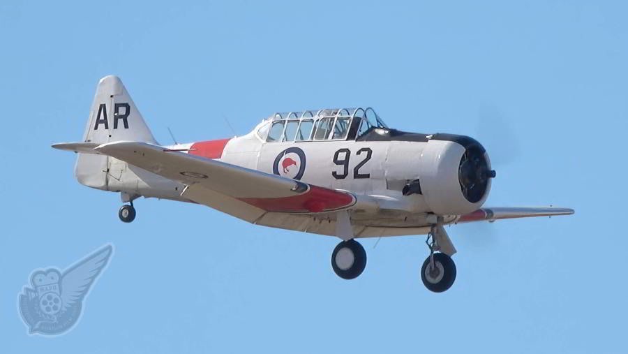 Bevan Dewes' North American Harvard NZ1044, an ex-RNZAF wartime trainer, surprised the crowd when it straffed the airfield with its machine guns, as most T-6/Harvard are not armed. This aircraft however was so equipped and was used at RNZAf Ohakea to trainer fighter pilots during the Second World War. Copyright © Historical Aviation Film Unit