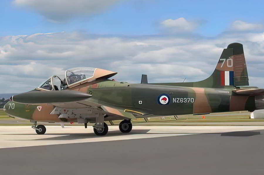 Manufactured: 1975 Built: 146 Serial: NZ6732 Registration: ZK-BAC Top Speed: 774 km/h Wingspan: 11.23m Height: 3.34m Length: 10.274m Engine: Rolls-Royce Viper Mk.535 turbojet, 3,140 lbf Range: 5121km Armament: 2 x 7.6 machine guns, up to 1,400kg of bombs, gun pods or rocket pods, plud fuel drop tanks for extra range.