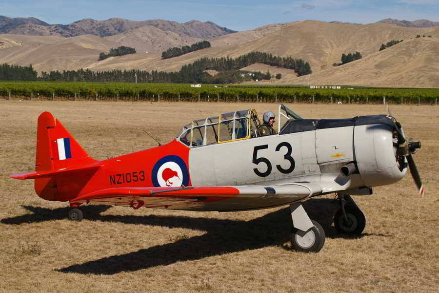 Harvard '53 takes off at Omaka Aerodrome.