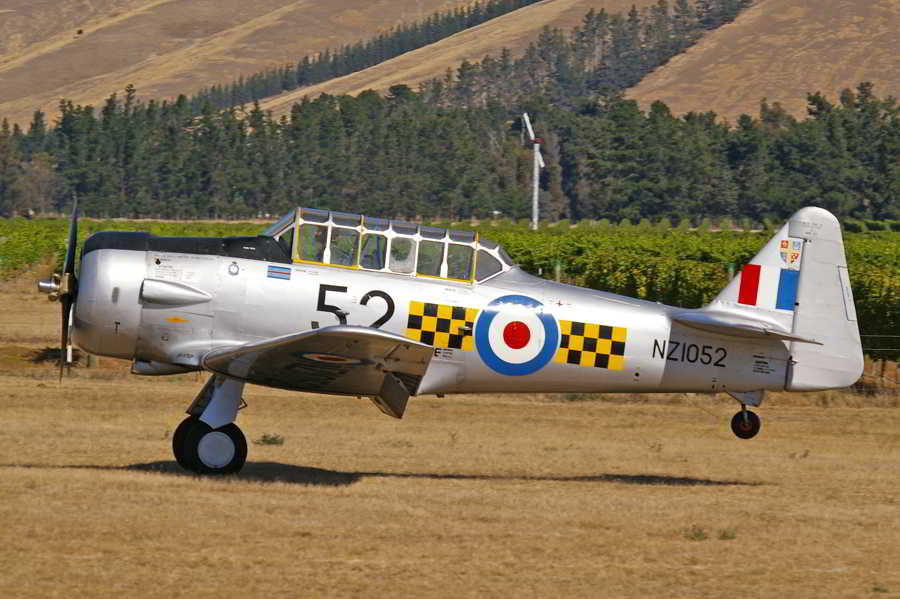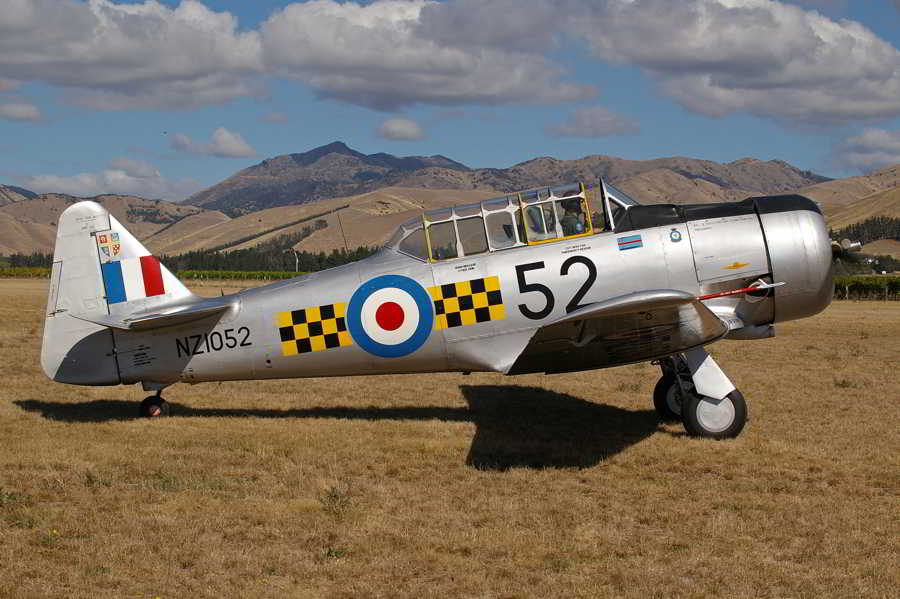 NZ1052 is seen here in the livery of No.2 "Wellington" Squadron of the New Zealand Territorial Airforce during the 1950’s (wearing the provincial black and yellow colours as a checkboard pattern). Surplus to requirements in 1978, the aircraft were dismantled and stored at MoTAT, before being bought by P. Burns of Christchurch in 1982 and then by M. Nicholls of Blenheim in 1987. The aircraft was rebuilt by Aero Tech at Ardmore in 1990-1991, and she was then on sold to be operated by the Harvard 1052 Syndicate.