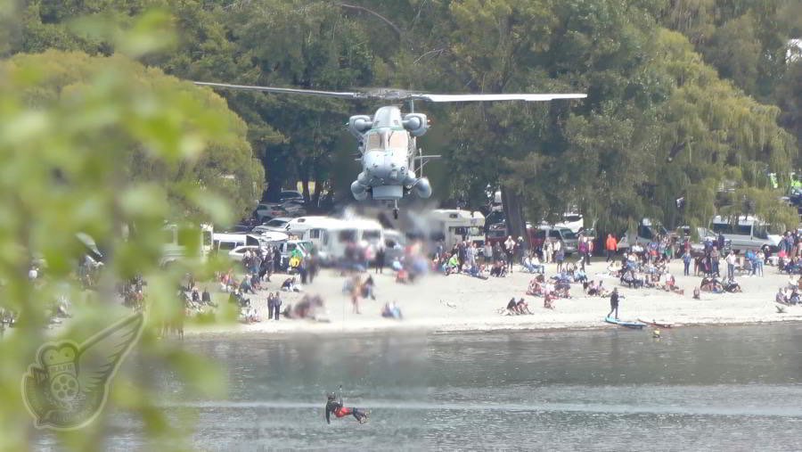 An RNZAF/RNZN Kaman Seaspite helicopter performs a simulated winch rescue over Lake Wanaka on the Friday evening of the airshow weekend. Copyright © Historical Aviation Film Unit