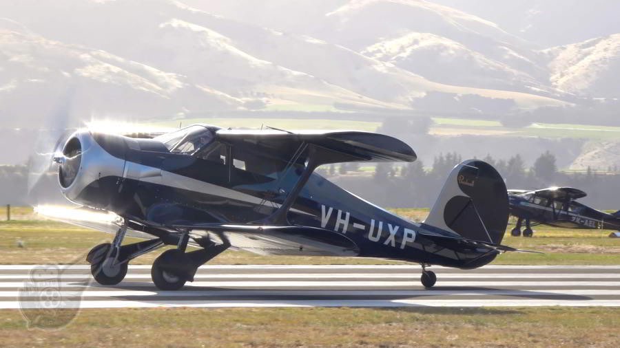 Beech Staggerwing VH-UXP is registered as an Australian aircraft, but is actually based in Wanaka. The Waco UOC 'Custom Cabin' aircraft seen in the background of this image is based at Omaka Aerodrome in Blenheim. Both aircraft displayed as part of the Vintage Classics segment at the airshow, and both showed off their remarkable 'art deco' period lines (form the 1930s). Copyright © Historical Aviation Film Unit