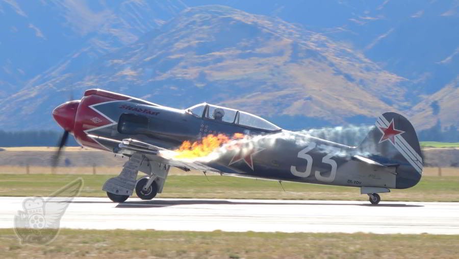 When pilot/owner Mark O'Sullivan switches on the Saunders smoke generators on his Yak 3U 'Steadfast' there's usually a lick of flame to be seen as the system starts up. Eagle-eyed watchers who spot this are often surprised as it's not usual to see flames dancing from an aircraft's wing-tip! Copyright © Historical Aviation Film Unit